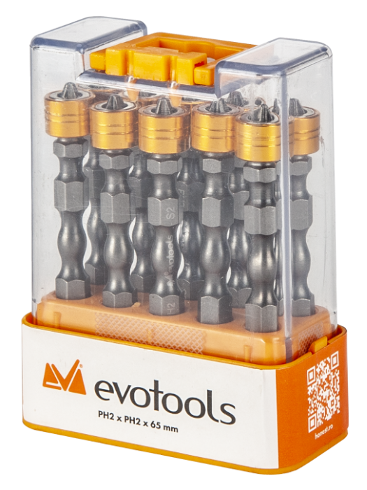 Οι δίδυμες μαγνητικές μύτες κατσαβιδιού EvoTools® είναι ειδικά σχεδιασμένες για να διευκολύνουν την εργασία σε κατασκευές με γυψοσανίδα. Είναι κατασκευασμένες από ατσάλι άνθρακα S2, υψηλής ποιότητας υλικό ανθεκτικό στη διάβρωση και στη φθορά, διαθέτουν δύο άκρα PH2 η καθεμία και μήκος 65 mm, χρήσιμο και σε δυσπρόσιτα σημεία. Στο ένα άκρο φέρουν ρυθμιζόμενο μαγνητικό στοπ, με ελατήριο, που σας βοηθά να ρυθμίζετε το βάθος του βιδώματος στη γυψοσανίδα, ανάλογα με τις ανάγκες: μερικώς βυθισμένη, πλήρως βυθισμένη κ.λπ.